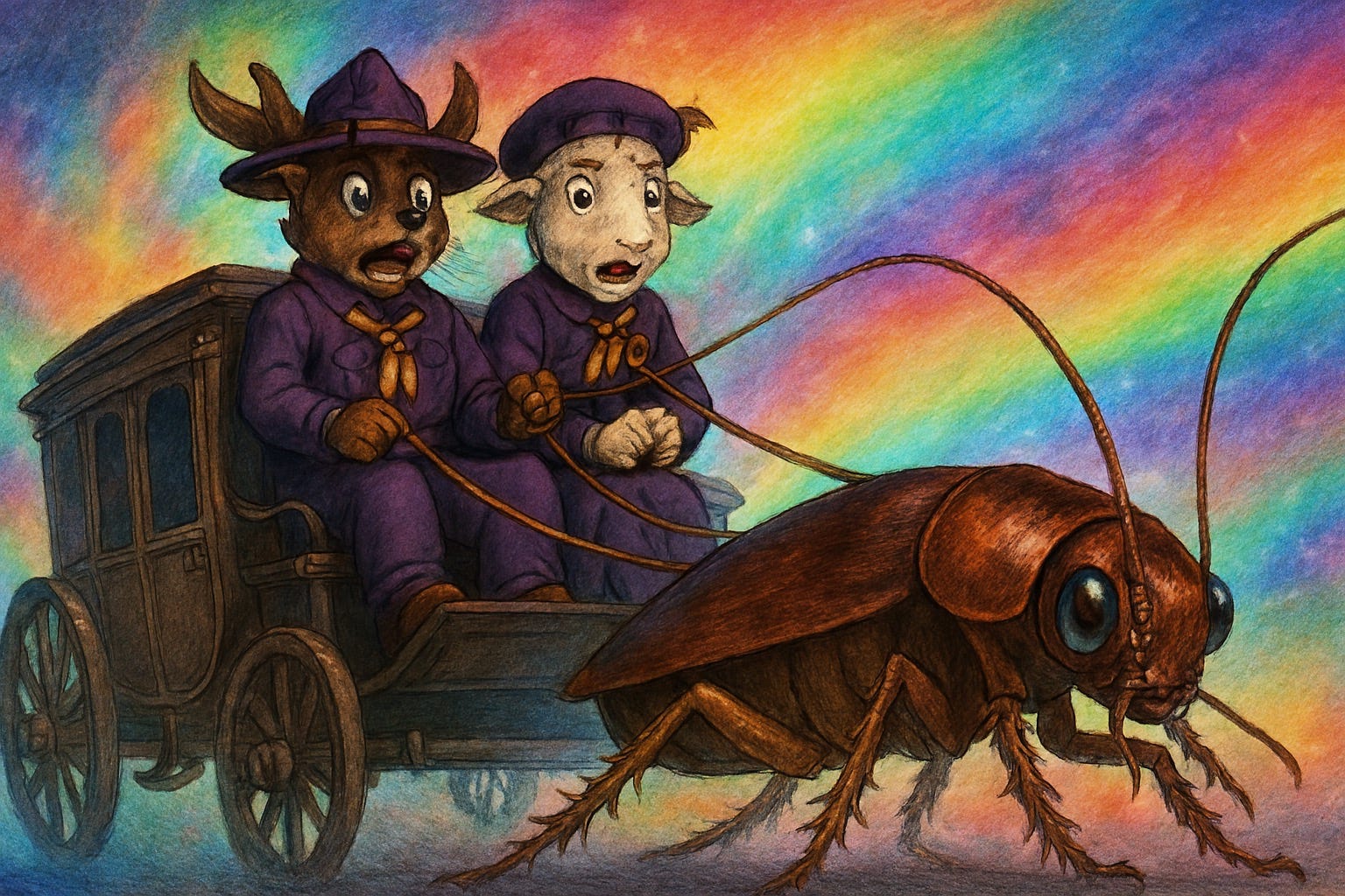 Beyond the cavern exit, the prince glimpsed an ethereal rainbow light that intensified as Jinnah drove the carriage forward. He could see many other vehicles on the dextral side drive forth and vanish with bright white sparks. On the sinistral side, such sparks heralded the arrival of vehicles onto this side of the fabled bridge. As he had never experienced this road before, Jaani knew not what to expect, with the carriage pulled forth by its trusty cockroach, the wagons ahead on their side of the highway numbering no more after a few seconds, a bright flash coming that made him blink.