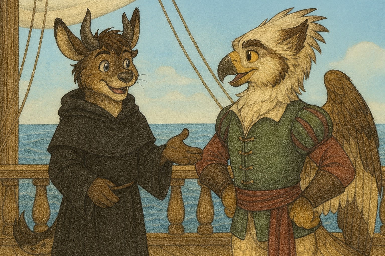 Jaani then led Monty through the balcony doors, closing them and turning to beyond the majesty of the seas, rife with many an ice chunk. Sternward he gazed, watching the Ferrojyan vessel leave its jetty and begin its trip to Baertaanjya. Monty leapt onto the railing and spread his wings, which made Jaani duck briefly. The prince extended an arm in case he lost balance, although the Grypfaan retracted his wings and dropped safely onto the balcony.