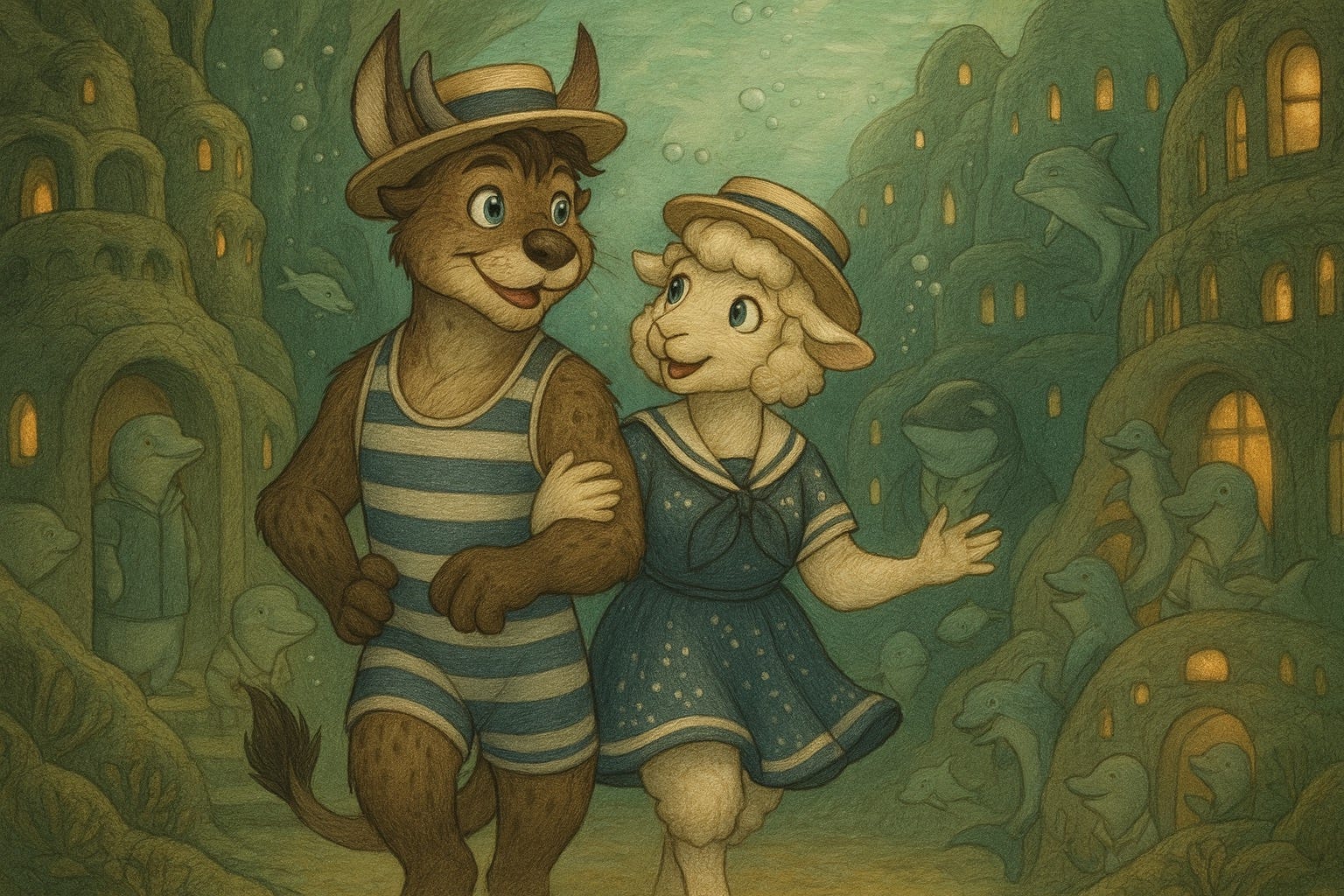 The ship continued to float towards the underwater city, drawing near a large cavern from which emerged many submarine sentinels that swam towards the vessel. The first was a gray sea otter that leapt grandly beyond the barrier and landed safely on the deck, his attire like Jaani’s but totally green and without a hat. Both his hair and eyes were blue, and he gazed at those who came to greet him. Other fellow underwater soldiers joined him on deck, river otters, dolphins, orcas, and so on, the last with quaking impact. The sea otter, in the meantime, bowed.